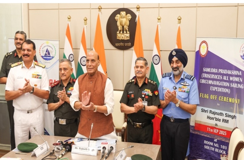 नई दिल्ली, (हि.स.)। पहली बार तीनों सेनाओं की महिला जल यात्रा ‘समुद्र प्रदक्षिणा’ गुरुवार को मुंबई से शुरू हुई, जिसमें 10 महिला अधिकारी अगले 9 महीनों में स्वदेशी नौकायन पोत त्रिवेणी पर सवार होकर लगभग 26 हजार समुद्री मील की यात्रा करेंगी। रक्षा मंत्री राजनाथ सिंह ने इस नौकायन अभियान को वर्चुअल माध्यम से हरी झंडी दिखाकर मुंबई के गेटवे ऑफ इंडिया से रवाना किया। राजनाथ सिंह ने इस यात्रा को नारी शक्ति, सशस्त्र बलों की एकता, आत्मनिर्भर भारत और भारत की सैन्य कूटनीति एवं वैश्विक दृष्टिकोण का ज्वलंत प्रतीक बताया है।